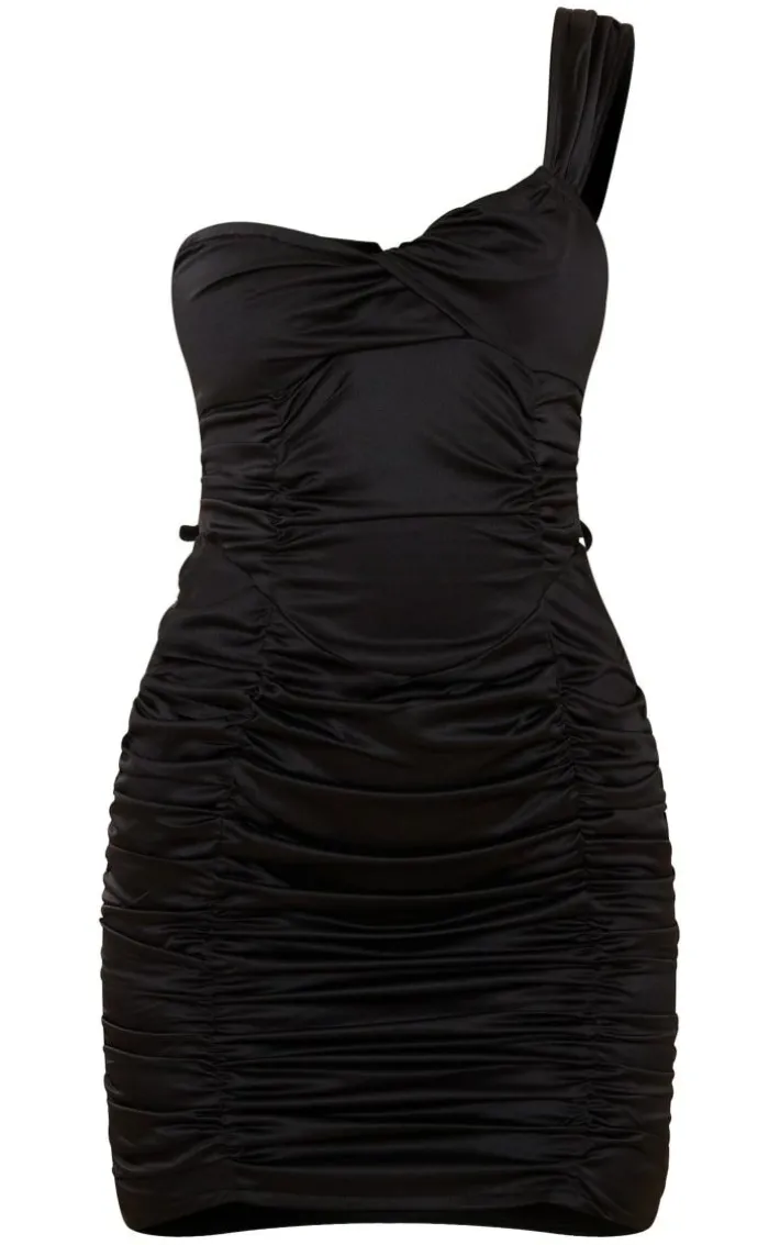 Give your wardrobe a seriously chic update with thisblack satin ruched one shoulder bodycon dress. This dress features a black satin material for all the sultry vibes this season. With a ruched detail and a bodycon fit, you are sure to show off your figure in all the right places, what’s not to love? Style with some black strappy heels and some statement earrings to finish off the look.