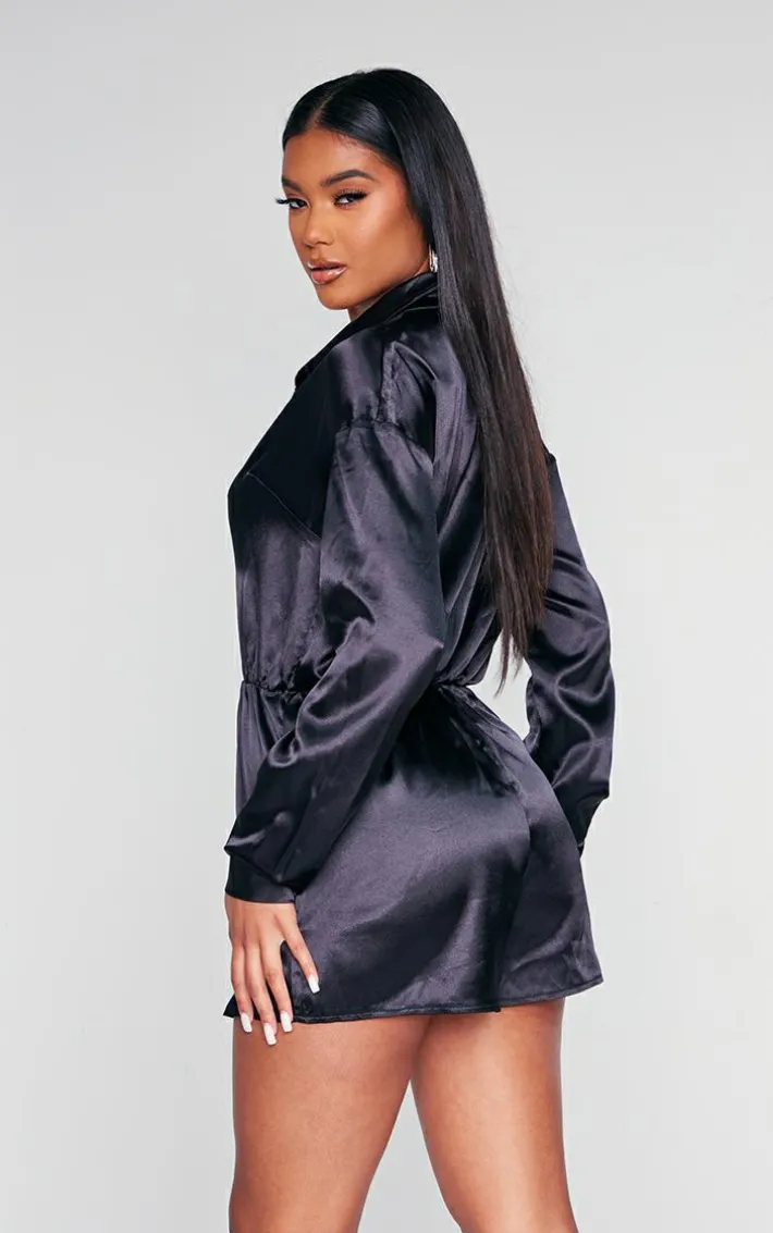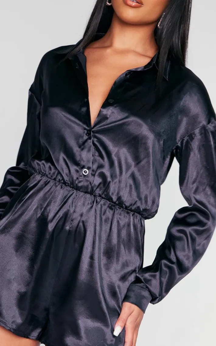 This romper is sure to give you a luxe look at the weekend. Featuring a black satin fabric with a button up front and elasticated waist, we love this styled with layered accessories and killer heels.