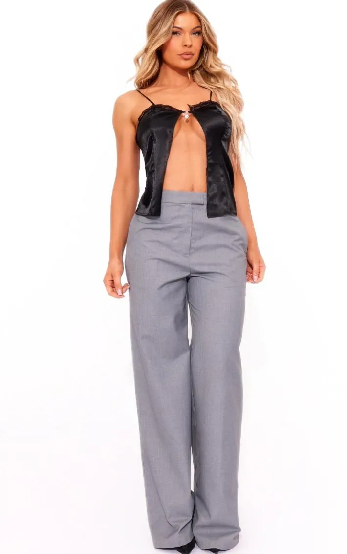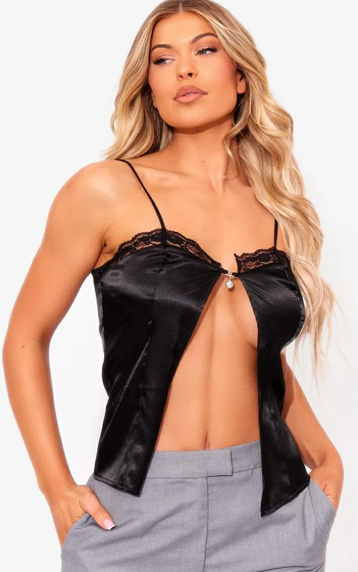Those black satin strappy lace trim split front cami top is here to banish any of your what to wear dilemmas. Brought to you in a black satin material with a strappy detail and a lace trim, we can’tget enough. From start to finish this split cami top will have you looking totally on-trend. For a next-level look simply style with some wide leg pants and a pair of heels. It’s a yes from us.