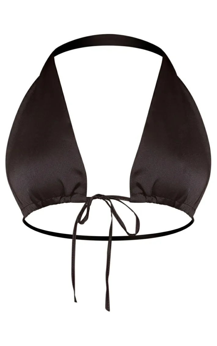 Get ready to have all eyes on you with this black satin tie front triangle bralet. This bralet is brought to you in a black satin material with a tie front and a triangle design, what’s not to love? This bralet will have you looking totally on-point this season. So what are you waiting for? Style this with the matching maxi skirt, gold accessories and high heels for a look that will have all eyes on you.