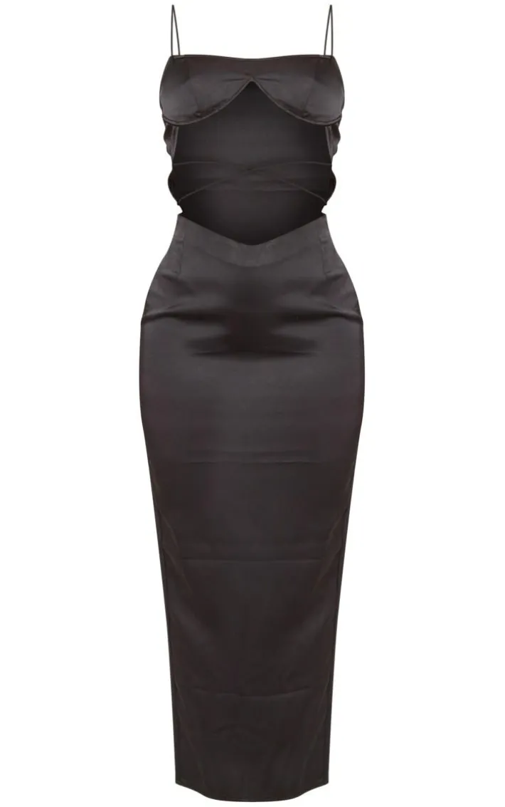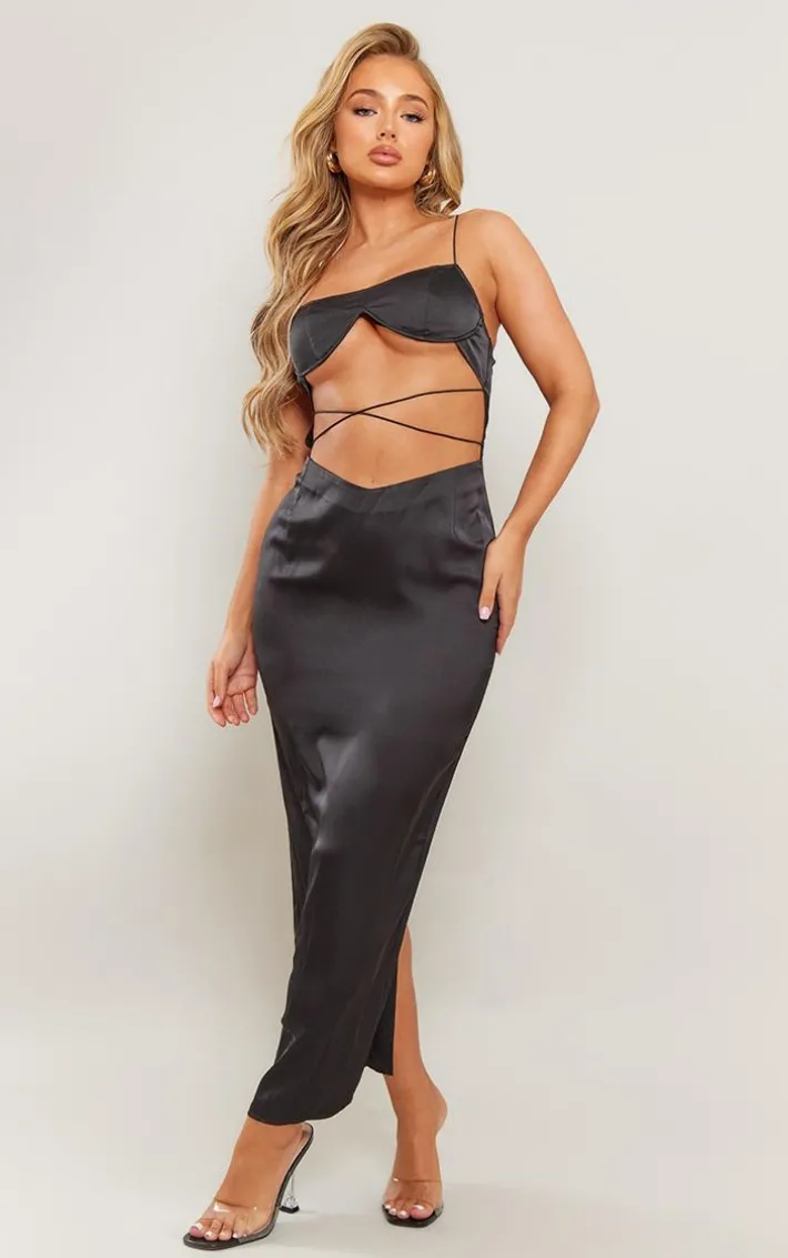 Be a showstopper this weekend with this black satin underwired strappy cut-out midaxi dress. Whether you have a black-tie event or a date night in the diary this midaxi dress is the ultimate glam choice. With a black satin material, underwired detail, and a strappy cut-out design, how could you say no? Style effortlessly with clear heels and a clutch bag for a look that will steal all the stares.