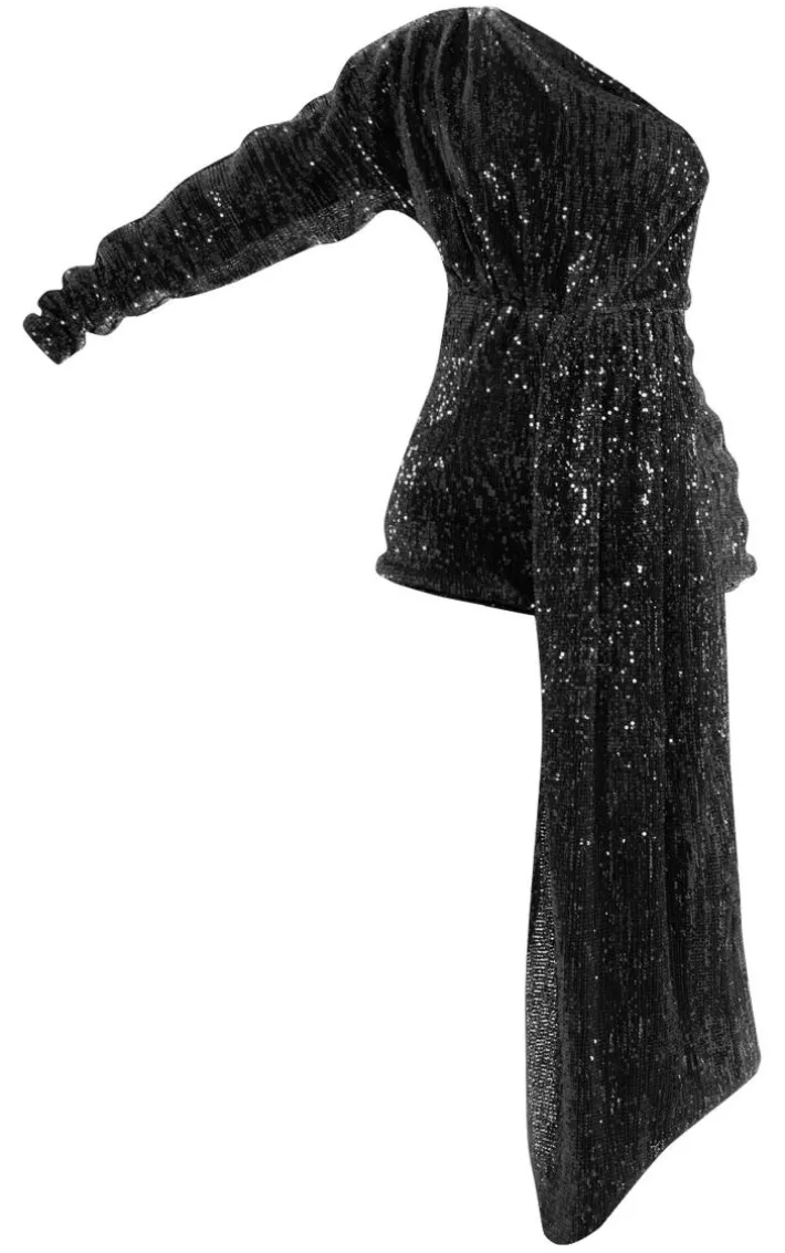 Create a look no one will forget with this black sequin drape detail one sleeve romper, get ready to have all eyes on you. With a black sequin material, a drape detail and a one sleeve design, this romper just went straight to the top of your hit list. Team it with slip-on heels and your fave accessories for a flawless finish.