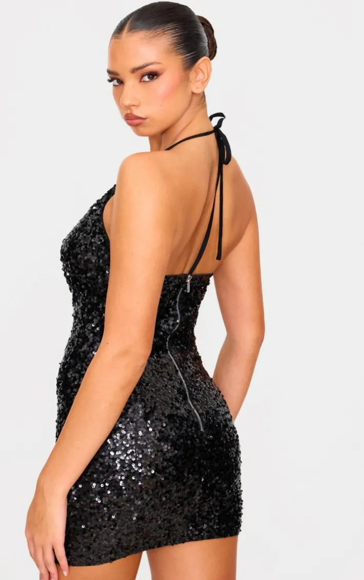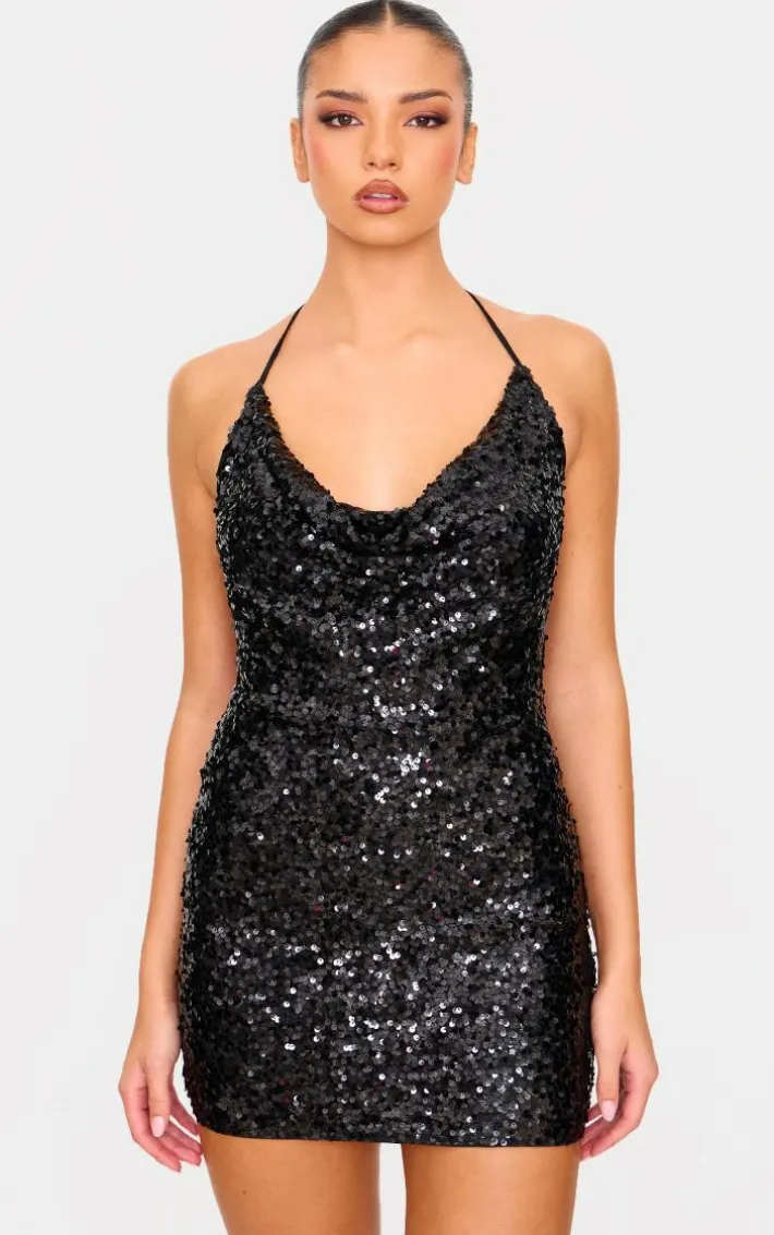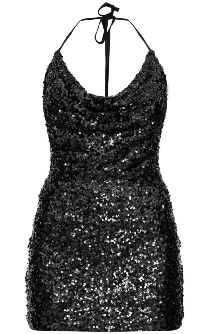 New partywear has landed with this black sequin tie cowl halter neck bodycon dress. Brought to you in a black hue sequin material with a cowl neckline, halter tie fastening and bodycon fit, how can you resist? Team with slip on heels and simple accessories for a look like no other.