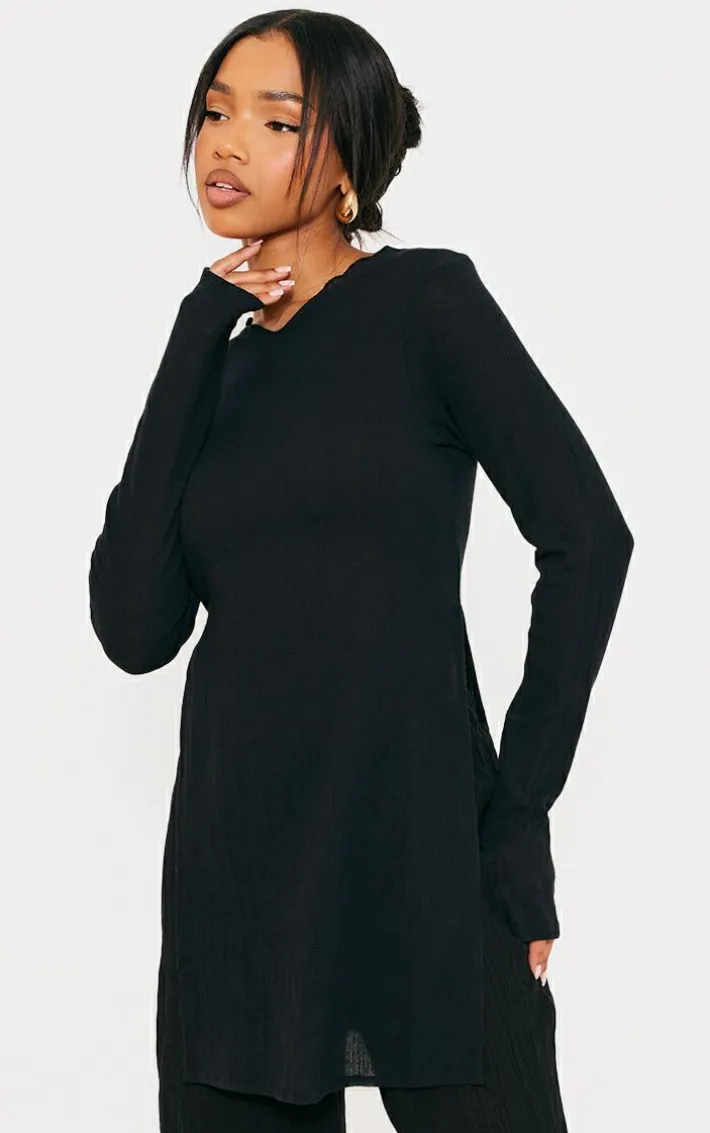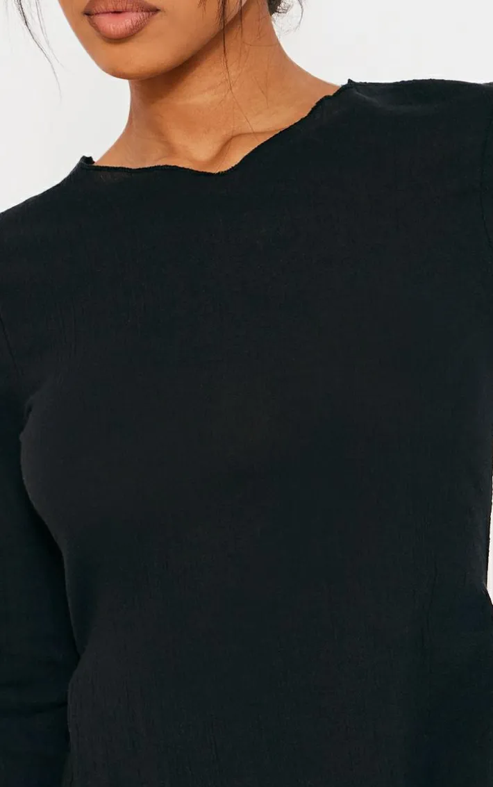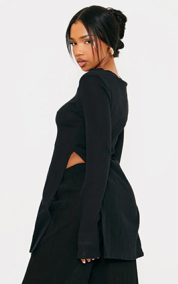 Make this black cheesecloth textured split sleeve long top a staple in your new season wardrobe. Brought to you in a black hue cheesecloth textured material with long sleeves, a split design and a longline fit, how can you resist? Style this long top with the matching pants, sandals and simple gold accessories for a simple yet chic everyday look.