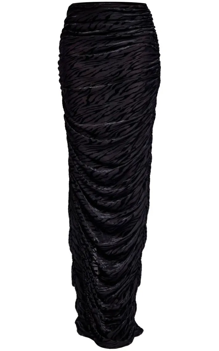 Be prepared to steal all the stares with this black sheer devore ruched midaxi skirt. Made from a black sheer devore material with ruched detailing and a figure-flattering fit, how could you say no? This midaxi skirt is sure to catch everyone’s eye in the room and take your weekend wardrobe to a whole new level. Why not shop the look and pair this midaxi skirt with the matching top, lace-up heels, and gold accessories for a look that will impress.