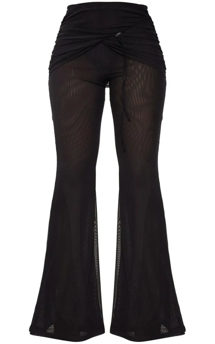 Take on the weekend the right way with these black sheer mesh drawstring fold over hem flared pants. Brought to you in a black sheer mesh material with a drawstring detail giving you a flattering fit like no other. Its fold over hem and flared design are perfect for those day to night looks and beyond. Team with some court heels and a statement jacket for a fool proof finish.