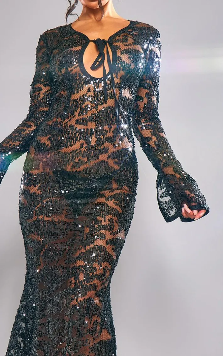 When the weekend calls for a little drama this black sheer sequin long sleeve tie front maxi dress will have you at the center of attention. It is made using a black sheer material with sequin detail, long sleeves and a tie front, what more could you want ? Style this with clear slip-on heels and statement accessories to elevate the look further.