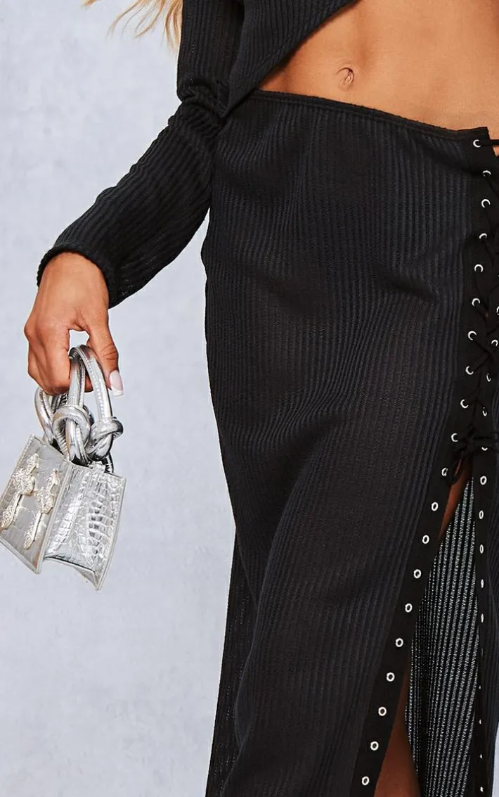 Make styling super simple with this black sheer soft rib lace-up thigh split midaxi skirt. Whether you’re meeting upor got a date night in the diary, this midaxi skirt is sure to tick all the dress code boxes. Made from a black sheer soft rib material with lace-up detailing and a thigh split design, what’s not to love? Shop the look and team this midaxi skirt with the matching top, clear heels and a mini bag for a look is sure to get you noticed.
