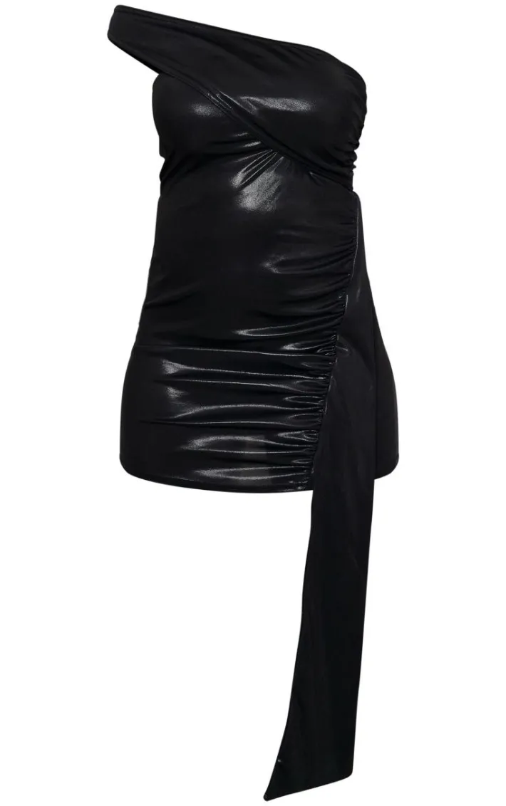 Turn heads for all the right reasons in this black shimmer one shoulder ruched side bodycon mini dress. Brought to you in a black shimmer material with a one shoulder design, ruched detailing and a bodycon fit, how could you not be in love? If you’re looking to impress this weekend then this mini dress is calling your name. Team with statement heels and a diamante bag for a look that is sure to make you stand out from the crowd.