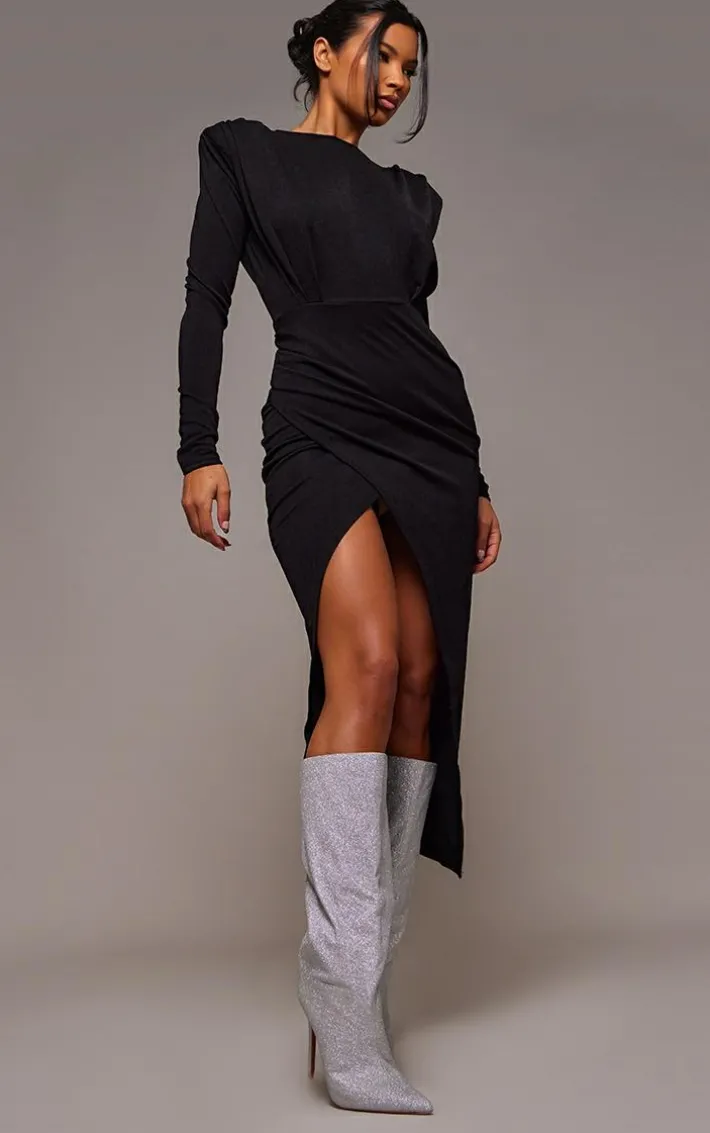 This black shoulder pad long sleeve midaxi dress is here to solve all of your weekend wardrobe dilemmas. Brought to you in a black hue material with long sleeves, shoulder pads and in a midaxi fit, how can you say no? Seriously chic and in a flattering fit, you are sure to steal all the stares in this black dress. Just add statement heeled boots and glam accessories to elevate the look.