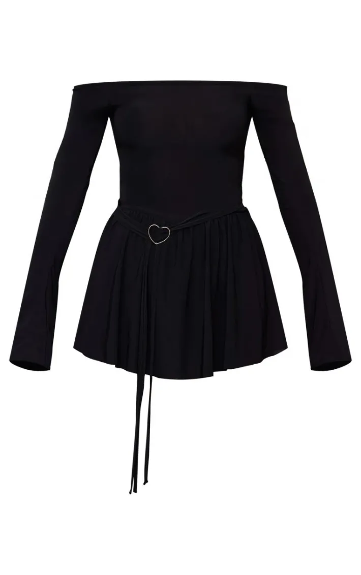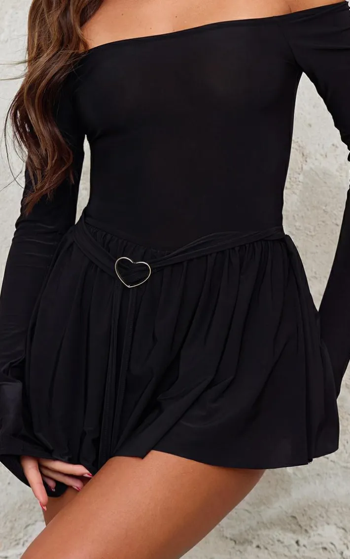 Have all eyes on you with this black slinky bardot long sleeve heart trim romper. Brought to you in a black slinky material with a bardot design and a long sleeve fit, we are obsessed. This romper has a heart trim detail that will make you center of attention. Team with your fave accessories and a pair of court heels for a look like no other.