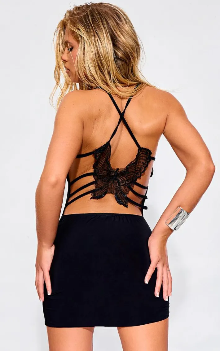 Your collection is calling out for an update, and we have got you covered with this black slinky butterfly trim back mini dress. Brought to you in a black slinky material with a butterfly trim back, we cant get enough. Its mini length will turn heads no matter what the occasion. Team with your fave accessories for a look like no other.