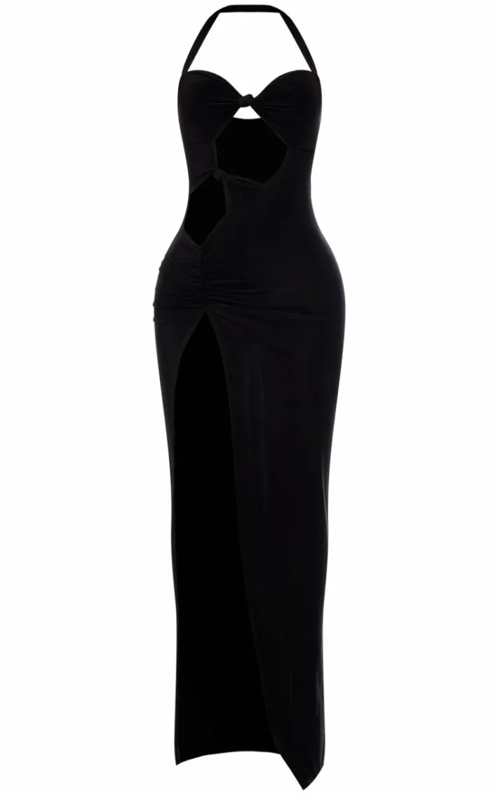 We know you’re going to look fiercely feminine in this black slinky cut out knot detail split maxi dress. Brought to you in a versatile black shade, with a luxe slinky material, cut out design, knot feature and split detail, how can you resist? You’ll be turning heads for all the right reasons. Style with some clear heels and gold accessories for a vibe we can’t get enough of.