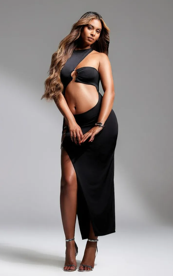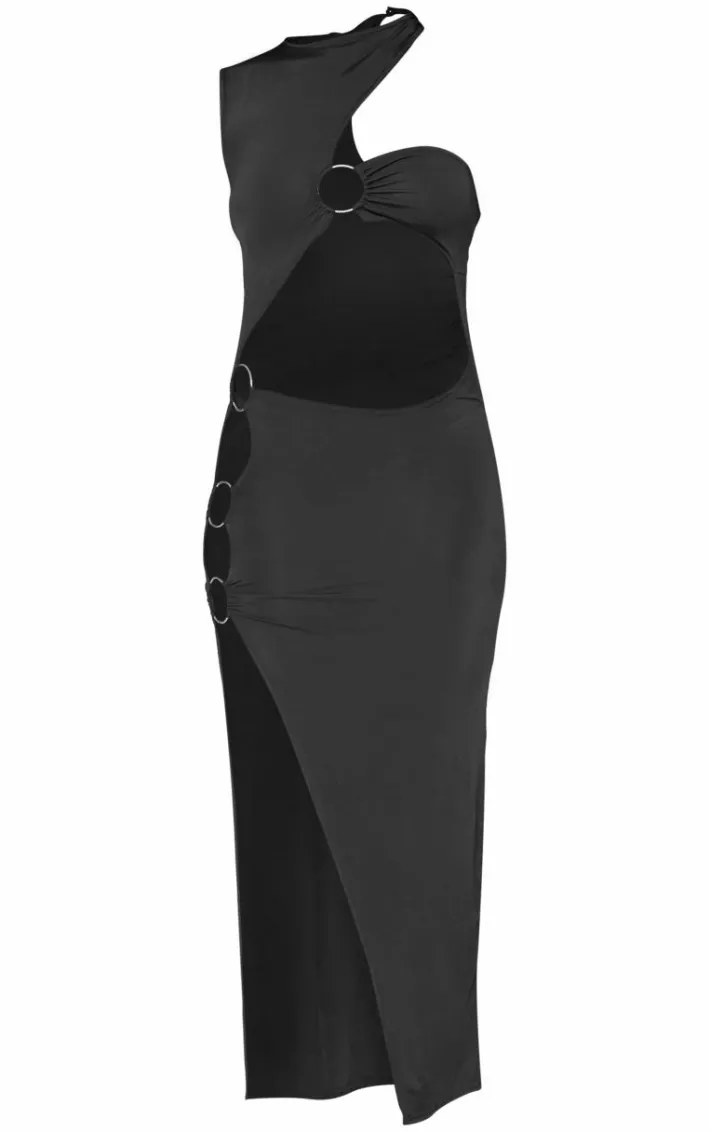 Turn heads for all the right reasons in this black slinky high neck ring detail cut out midi dress. Brought to you in a black hue slinky material with a high neck design and ring detail, this cut out midi dress is calling your name. Style with silver heels and statement accessories for a figure-hugging fit.