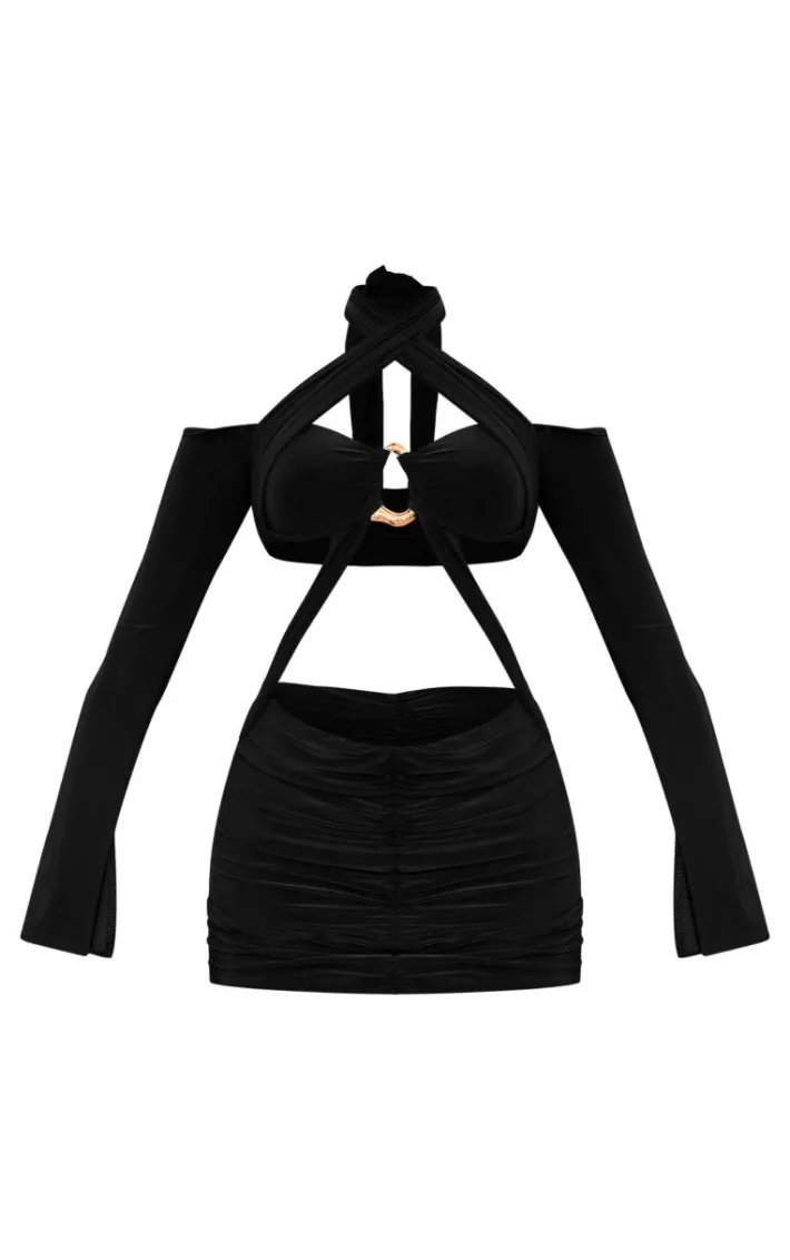 Set major trends with this black slinky long sleeve trim detail cut out mini dress. Brought to you in a black slinky material with a long sleeve design giving you a flattering fit like no other. This cut out mini dress has a trim detail adding all the glam vibes to any outfit. Team with a pair of your fave heels and gold accessories for a look like no other.