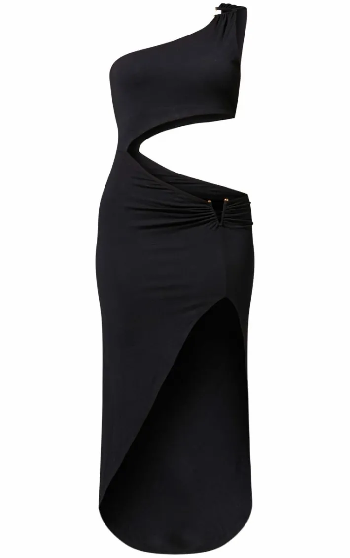 When the weekend calls so does this black slinky one shoulder trim detail cut out midaxi dress. Brought to you in a black hue slinky material with a trim detail and cut out design, this one shoulder midaxi dress is seriously unreal. It’s a yes from us. Pair with simple accessories and gold heels for a look like no other.