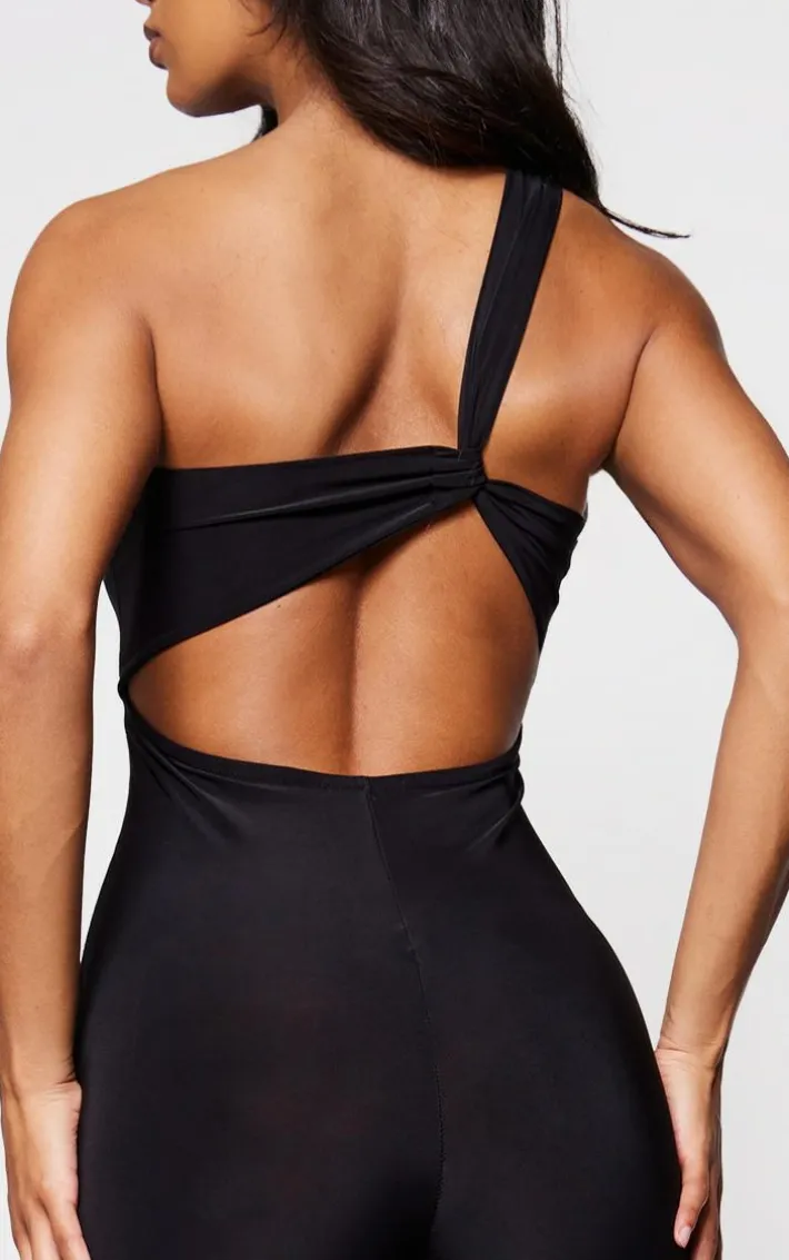 Have all eyes on you in this black slinky one shoulder twist back detail jumpsuit. Brought to you in a new season jumpsuit fit, with a figure-hugging slinky black fabric and a fierce twist back detail, your next weekend ‘fit is sorted. Just add a pair of black court heels and your go-to accessories for a look that isn’t to be missed.