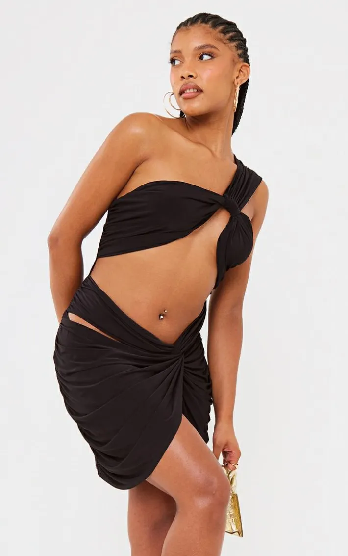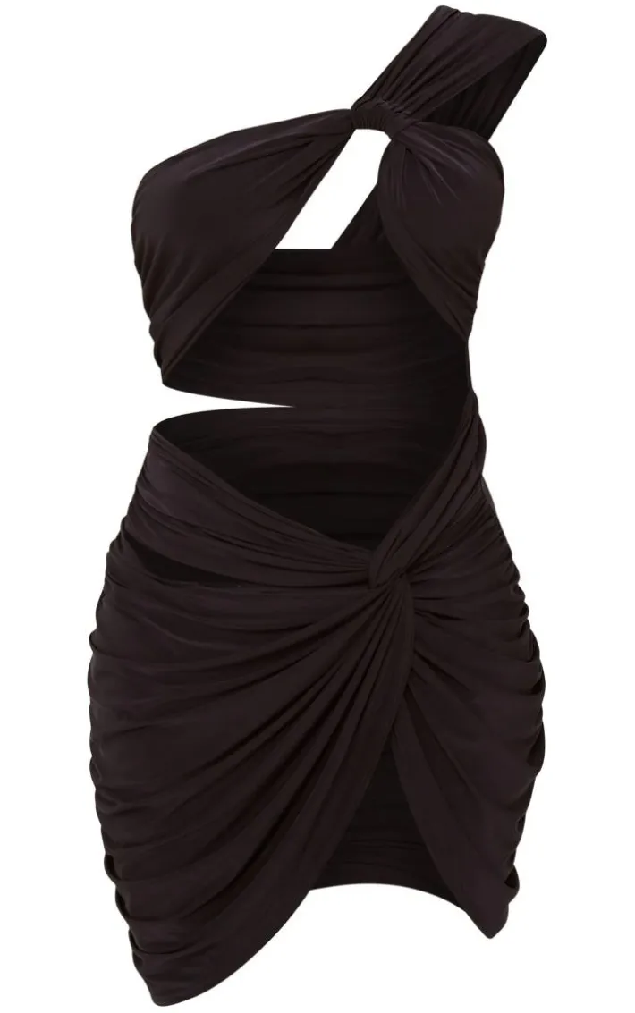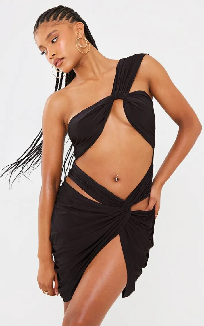 Take your little black dress look that little bit further with this black slinky one shoulder twist skirt extreme cut out bodycon dress. Brought to you in a black hue slinky material with a one shoulder design, a twist skirt and extreme cut out detailing, how can you not be obsessed? Style this bodycon dress with clear strap heels and statement gold accessories for a look that is sure to make you stand out from the crowd for all the right reasons.