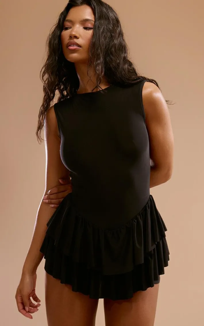 We’re totally in love with this black slinky rara skort romper for your weekend plans. It is made from a black slinky material with a rara style, how could you not be obsessed? This romper gives you endless styling potential and is bound to give your look that extra chic touch. Style seamlessly with the matching top, black court heels and gold accessories for a seriously luxe finish.