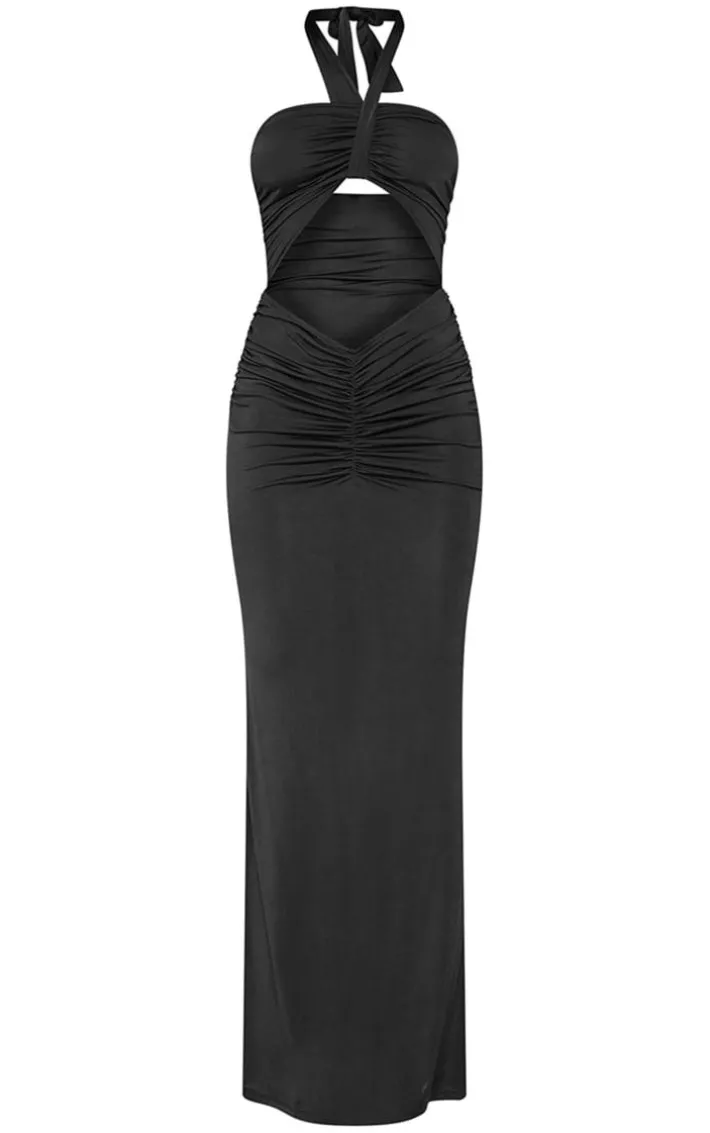 Say goodbye to all your what-to-wear dilemmas with this black slinky ruched cut out halter knot detail maxi dress. Brought to you in a black slinky material with ruched detailing and a cut-out design, what more could you ask for? This maxi dress also features a halter knot neckline and a super flattering fit. No matter what your plans are this maxi dress is sure to impress with clear heels and gold accessories. Its a yes from us.