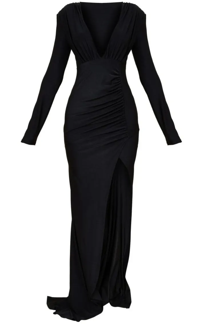 Take your weekend look from 0-100 with this maxi dress. Featuring a black slinky material with shoulder pads and a wrap skirt design. Style with heeled mules and your fave accessories for the ultimate showstopper look.