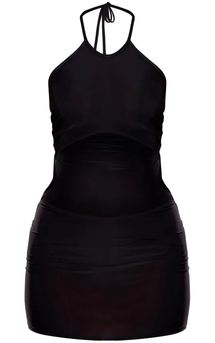 Make a statement whatever your weekend plans in this black slinky spaghetti strap halterneck cut out bodycon dress. Brought to you in a versatile black hue, with a flattering slinky material, spaghetti strap halterneck design and cut out detail, how can you not love? Simply style with a pair of court heels for a look that’ll have you feeling your most confident.
