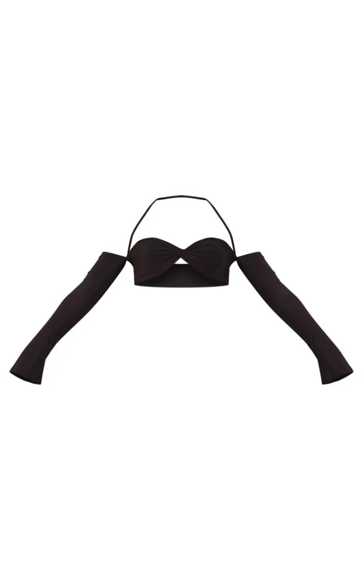 Bring the drama to your weekend look with this black slinky twist front long sleeve bardot top. Made from a black slinky material with a twist front design, a bardot neckline and long sleeves, what’s not to love? Style this bardot top with the matching skirt, heels and gold accessories for a look that is sure to make heads turn wherever you go.