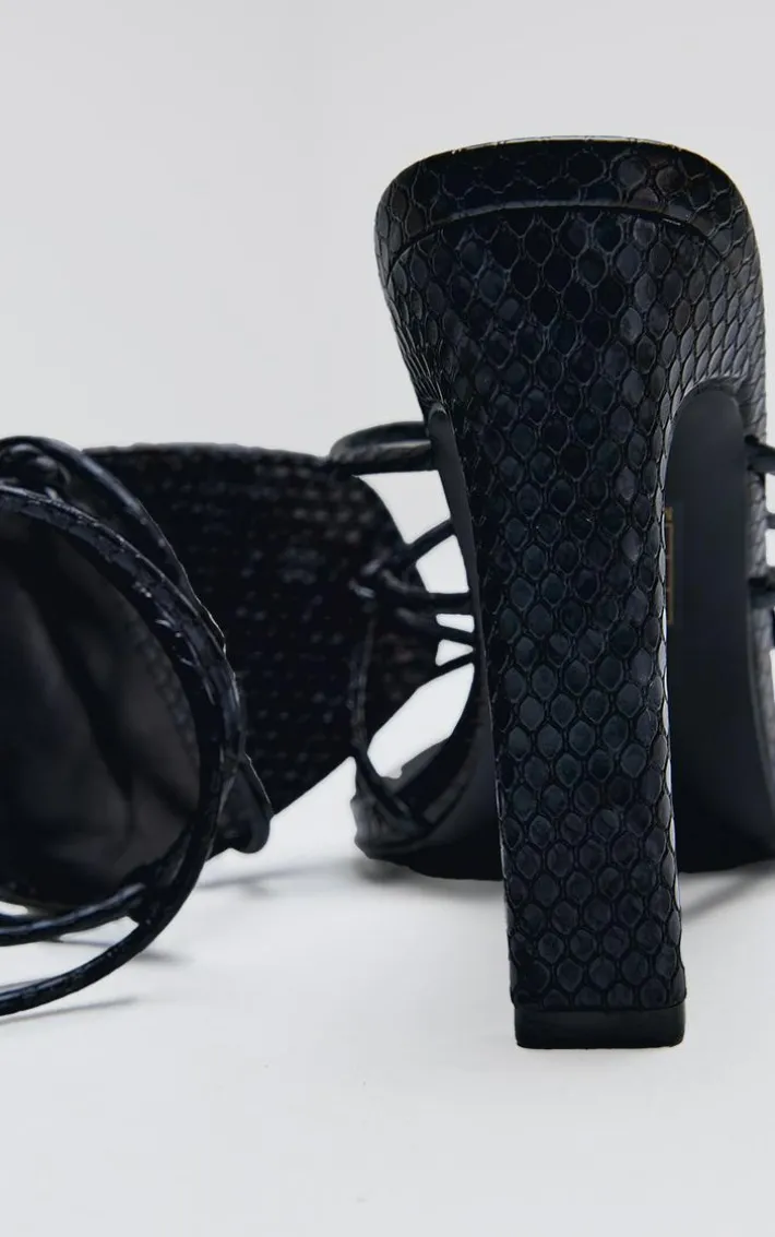 These black snake PU round toe heeled mules are about to become your new weekend staple. Brought to you in a black snake PU material with a round toe design, how can you resist? Style these heeled mules with your weekend outfit for a chic finishing touch to any look.