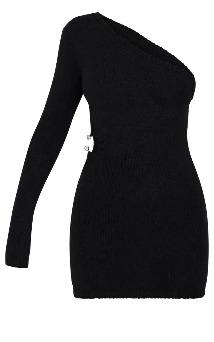 Introducing elegant silhouettes with this black soft knit trim detail cut out one shoulder mini dress. Made with a new season soft knit fabric, a daring cut out detail and one shoulder design, this is a must-have mini dress for party season. Style with strappy black heels and silver jewelry for an elevated finish.