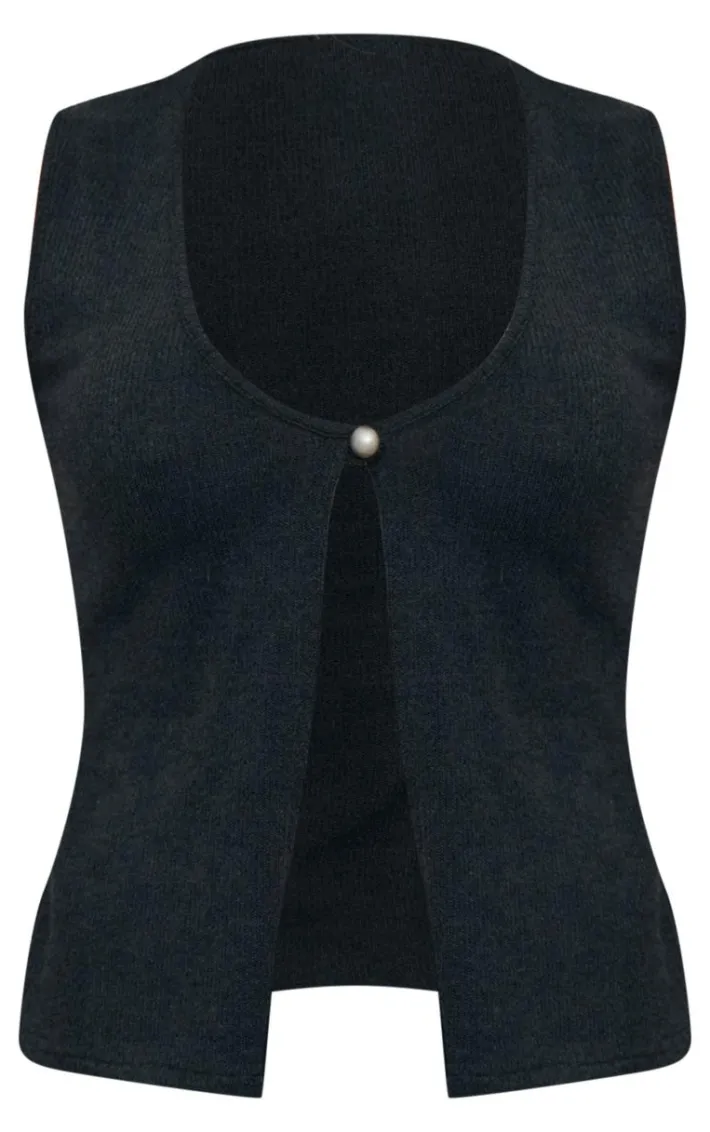 Look all kinds of chic in this black soft rib button front vest. Brought to you in a black hue soft rib material with a button front fastening, this vest is at the top of our wish list. Style with the matching maxi skirt, slip on mules and your fave accessories to finish the look.