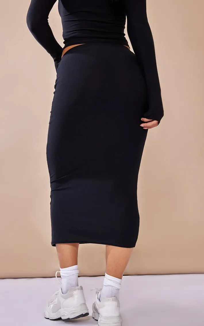 Add some seriously chic vibes to your wardrobe with this midi skirt. Featuring a black soft touch material with a flattering fit, we’re obsessed. To earn all the style points just add the matching top, chunky kicks and a trench coat.