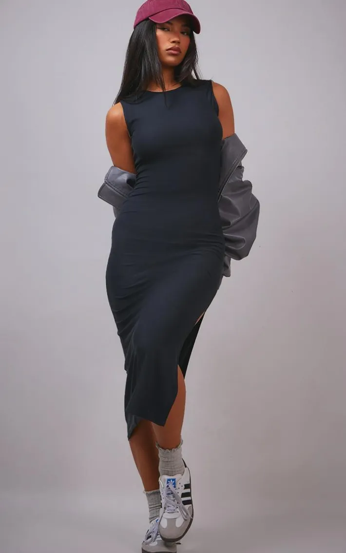 Meet your new season wardrobe essential with this black soft touch racer neck sleeveless midaxi dress. It is made using a black soft touch material with a racer design and a sleeveless style, you’re sure to be earning all the likes. Pair with sneakers, a faux leather jacket and a cap for a look that will have you nailing major trends.