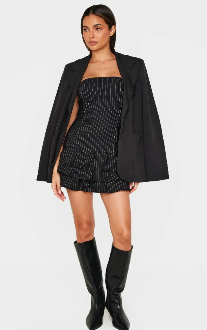 Your everyday has just been elevated with this black stitch detail bandeau frilled shift dress. Brought to you in a black hue material with a stitch detail, bandeau neckline and frilled hem, this shift dress is a must have. How can you resist? Pair with knee high heeled boots and gold accessories for a look like no other.
