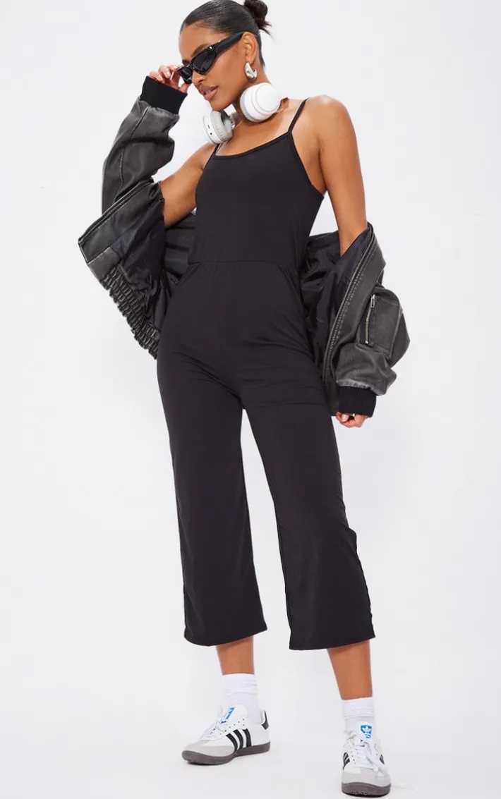 This simple jumpsuit is perfect for those chilled days. Featuring a black jersey material with thin straps and culotte bottoms. Style this with an oversized shirt and fresh kicks to complete the look.