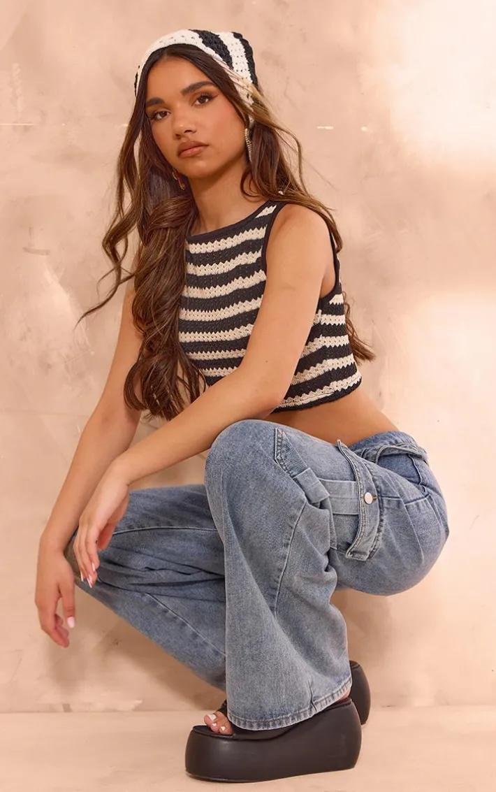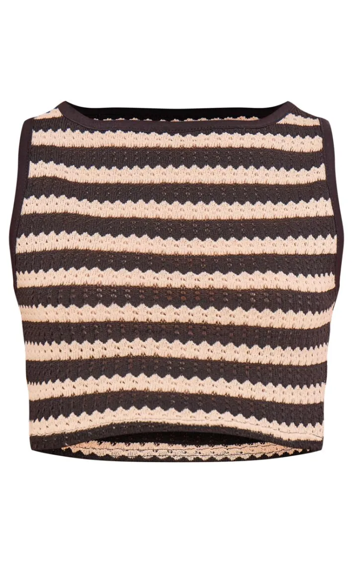 Upgrade your weekend wardrobe with this black knit stripe racer crop top. Brought to you in a black stripe knit material with a racer style and cropped length, what’s not to love? Pair this crop top with baggy jeans, flatform sandals and your fave accessories to take this look to the next level.