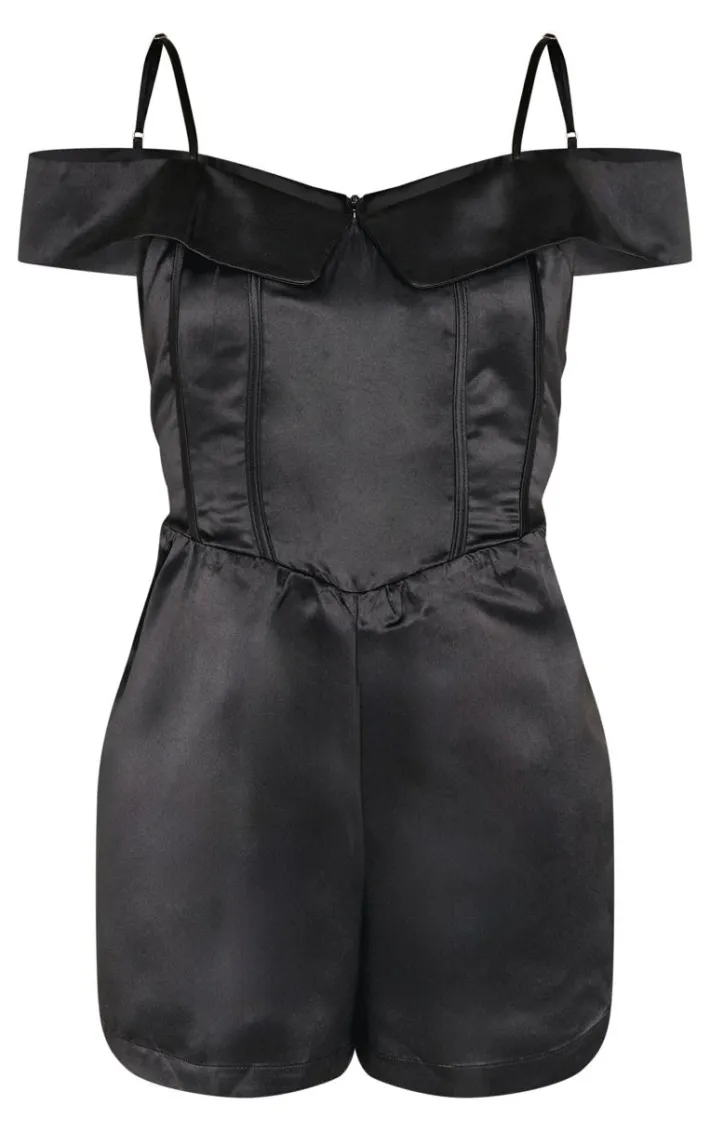 Deciding what to wear this events season just got easier with this black structured satin bardot floaty romper. Brought to you in a black hue satin material with a structured detail, bardot neckline and floaty design, this romper is all the new you need. Switch up your style and pair with statement heels and simple accessories for an elevated finish.