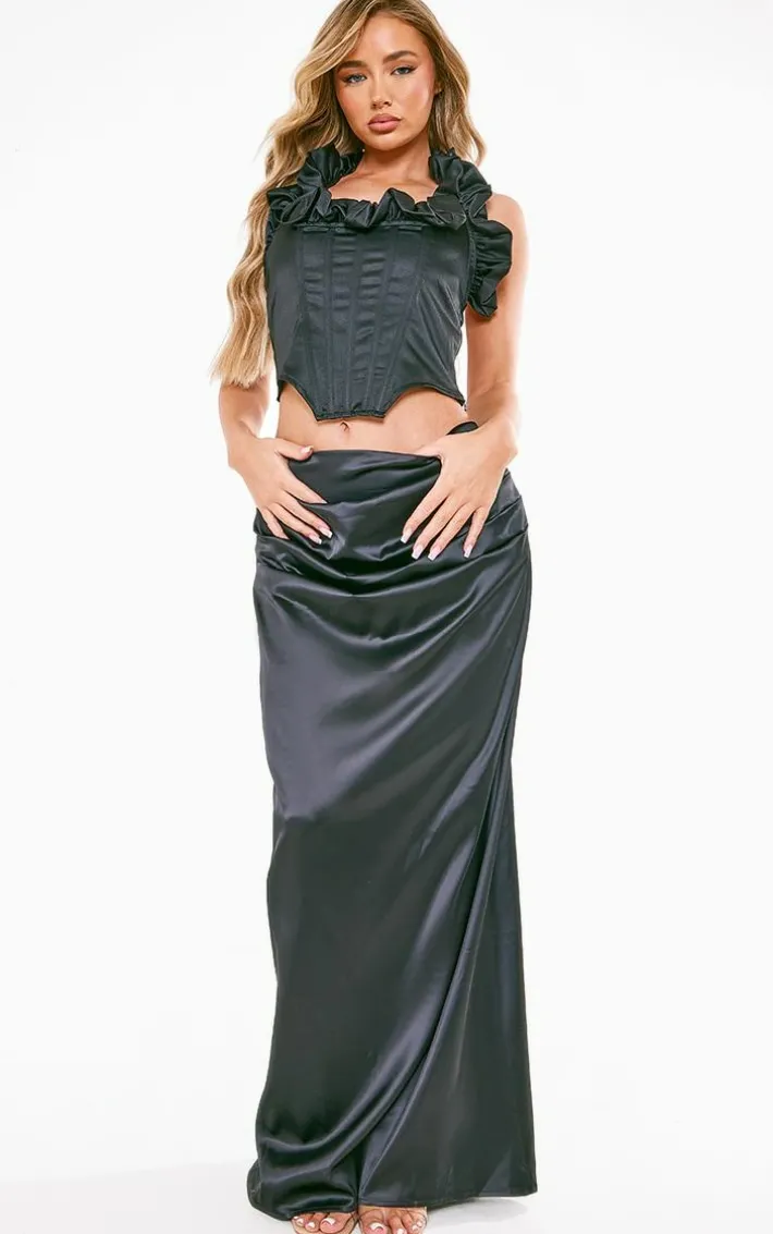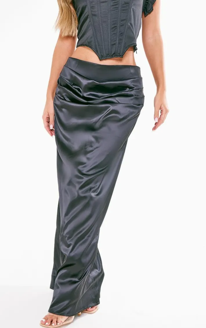 Got a special occasion coming up ? Then this black structured satin ruched waist maxi skirt is here to solve all your styling dilemmas. It is made using a black satin material with a ruched waist design and a maxi length, how could you not be in love? Simply pair with a corset top, heels and your fave accessories for a dreamy finish.