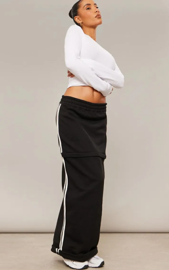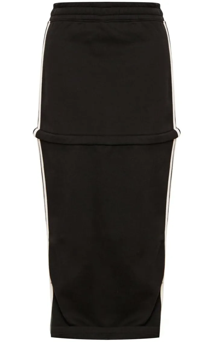Level up your new season wardrobe essentials with this black sweat zip off side stripe maxi skirt, you’re sure to be earning all the likes. This maxi skirt features a black sweat material with a zip off design and a side stripe detail, what more could you want? Pair this skirt with a basic long sleeve top, chunky sneakers and your fave accessories for a chic, off-duty look.