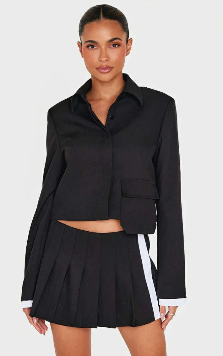 Elevate your look this season with this black tailored pleated mini skort. Brought to you in a black hue material with a tailored design and pleated detail, this mini skort is all the new you need. Team with a cropped blazer, slip on heels and gold accessories for a chic finish.