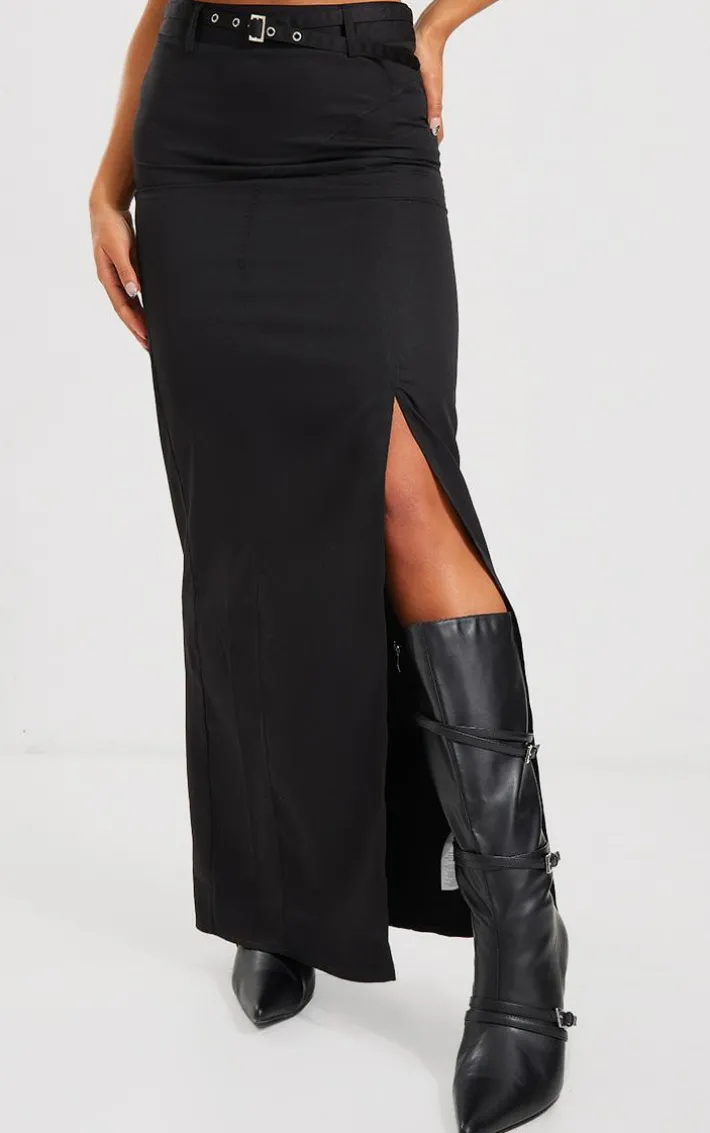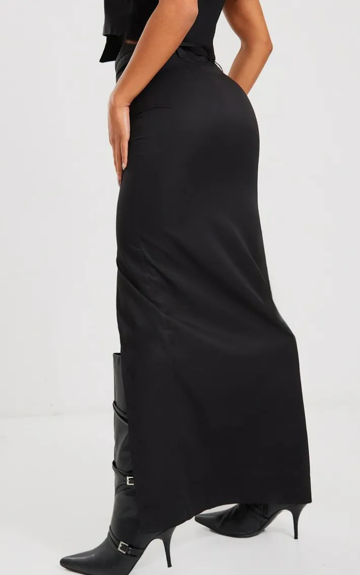 This black tailored woven belted maxi skirt is about to become your new wardrobe staple. Brought to you in a black hue woven material with a chic tailored fit, a belted design and a flattering maxi length, how can you not be obsessed? Style this maxi skirt with a crop top, knee length heeled boots and statement accessories for a seriously chic look like no other.