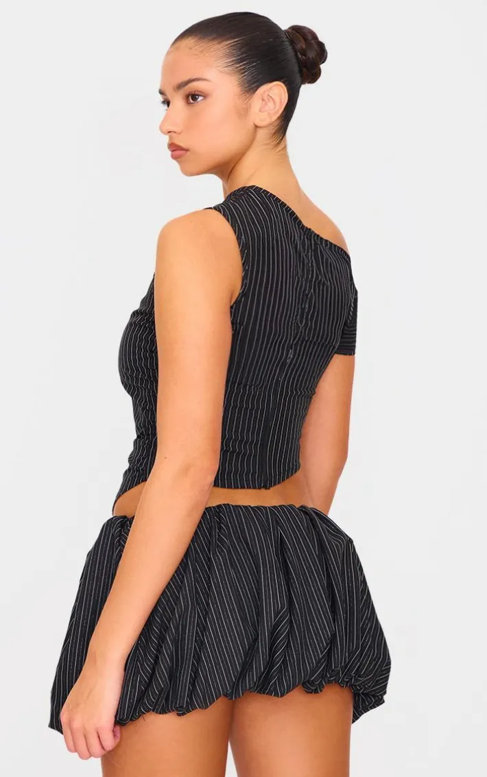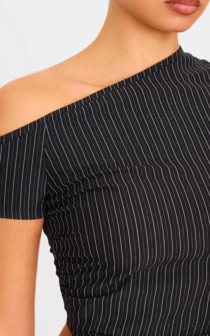 Keep it chic in this black tailored woven glitter pinstripe asymmetric top. Brought to you in a black tailored woven material with a glitter pinstripe design and asymmetric detailing, how can you resist? Style this black top with the matching skirt and knee length heeled boots for a look that will really make a statement.