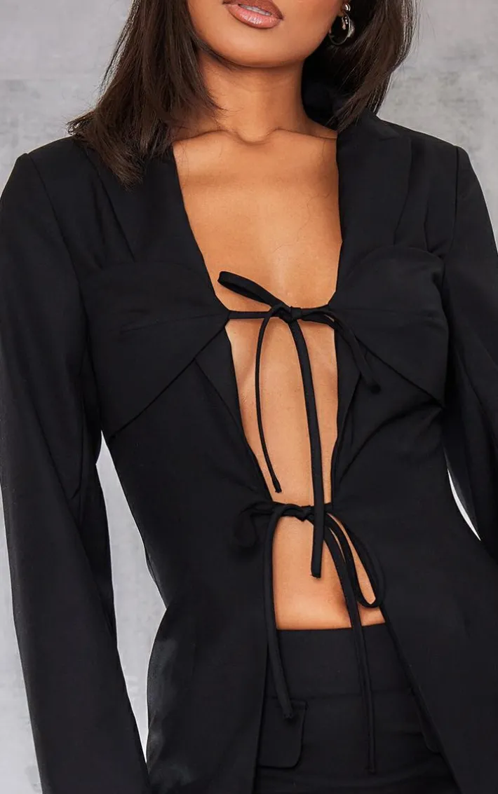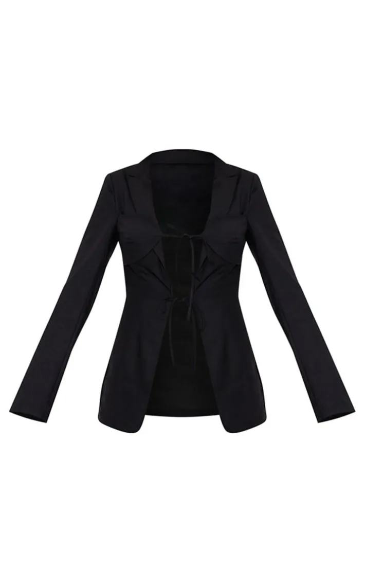 The weekend is here and this black tailored woven tie front longline blazer is the answer to all your what-to-wear dilemmas. Brought to you in a black woven material with a tie-front fastening and a tailored design, what more could you ask for? Super flattering and sure to nail the dress code, this blazer has it all. Team with the matching mini skirt, bold hue knee-high boots and a mini bag for a look that everyone will want.