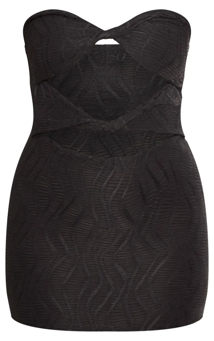 Found some last-minute weekend plans ? Then you need to add this black textured bandeau twist detail cut out bodycon dress to your basket. Made from a black textured material with a bandeau fit and a twist detail, how could you say no? Be prepared to turn heads for all the right reasons in this cut out bodycon dress. Simply add heels and statement accessories for a flawless finish.