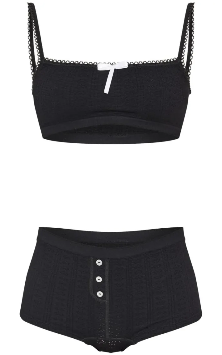 Hit refresh on your everyday basics with this black textured bralette and boxer lingerie set. This set includes a bralette and matching boxers, both in a black textured material, what’s not to love? Style this lingerie set under your outfit of the day for a comfy look we’re loving.