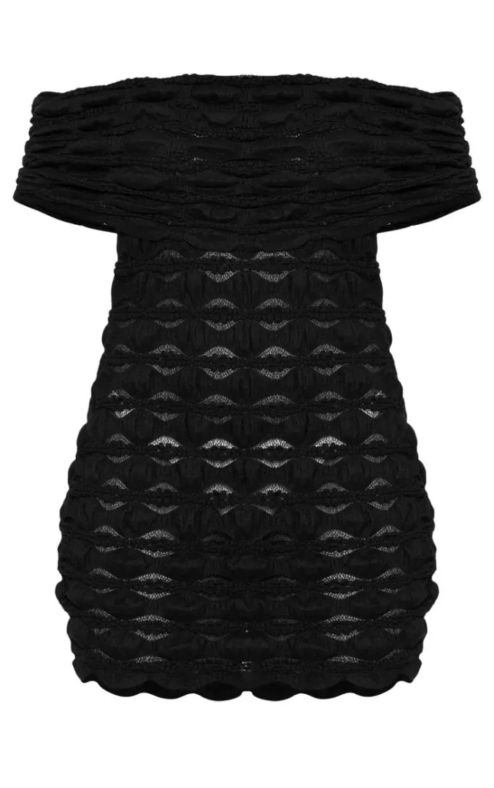 We’re totally in love with this black textured bubble jersey bardot bodycon dress for your weekend plans. It is made from a black textured bubble material with a bardot design and a figure-hugging fit, how could you not be obsessed? This bodycon dress gives you endless styling potential and is bound to give your look that extra chic touch. Style seamlessly with black high heels and gold accessories for a seriously luxe finish.