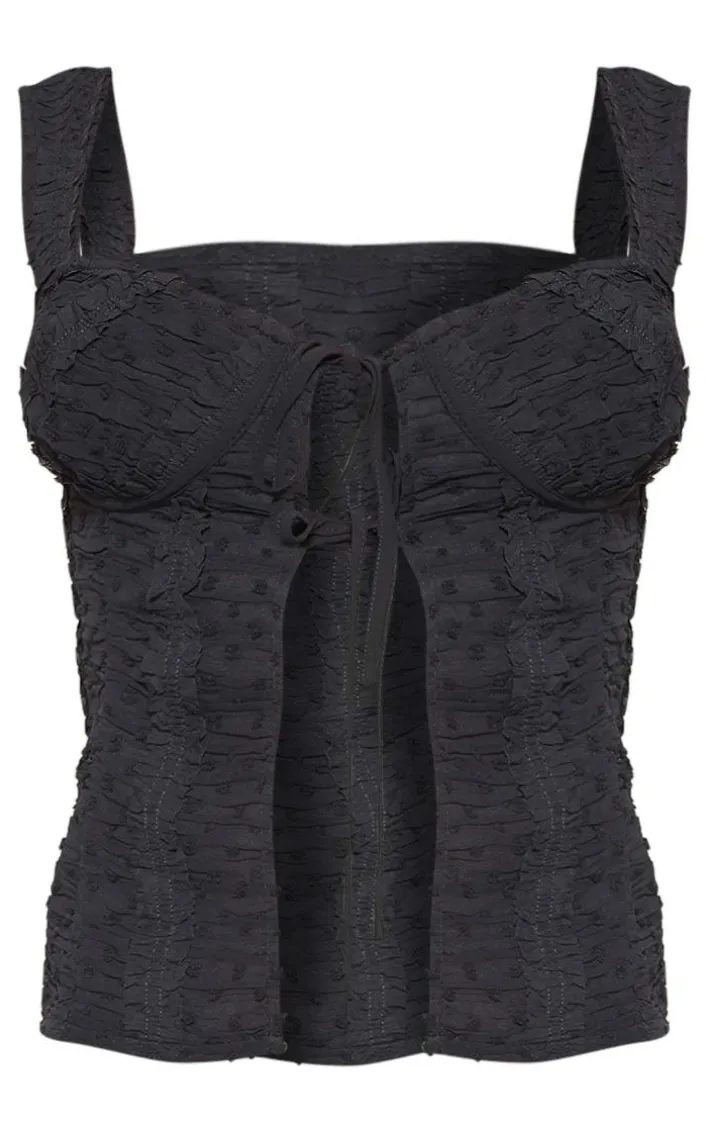 Take your weekend wardrobe that extra mile with this black textured chiffon frill tie front long top. Brought to you in a black textured chiffon material with frill detailing and a tie-front design, we’re seriously obsessing over this long top. Style it with the matching mini skirt, tie-up heels and statement accessories for a fierce look everyone will be asking about. You know you won’t be able to resist.