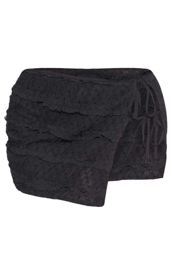 Have hearts racing with this black textured chiffon frill tie micro mini skirt. Brought to you in a black textured material with a chiffon frill and a tie detail, it’s a definite yes from us. Its micro mini length is all you need to have you tapping into your feminine side. Style with the matching top and a pair of statement heels for a look like no other.