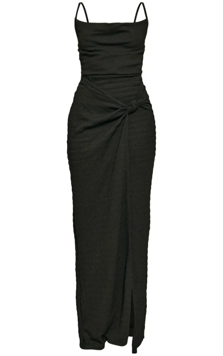 Turn heads wherever you step foot with thus black textured cowl knot detail maxi dress. Brought to you in a black textured material with a cowl design and a knot detail, we are seriously obsessed. Thus maxi dress is all you need to elevate the look instantly. Team with a pair of heels and a statement bag for a look like no other.