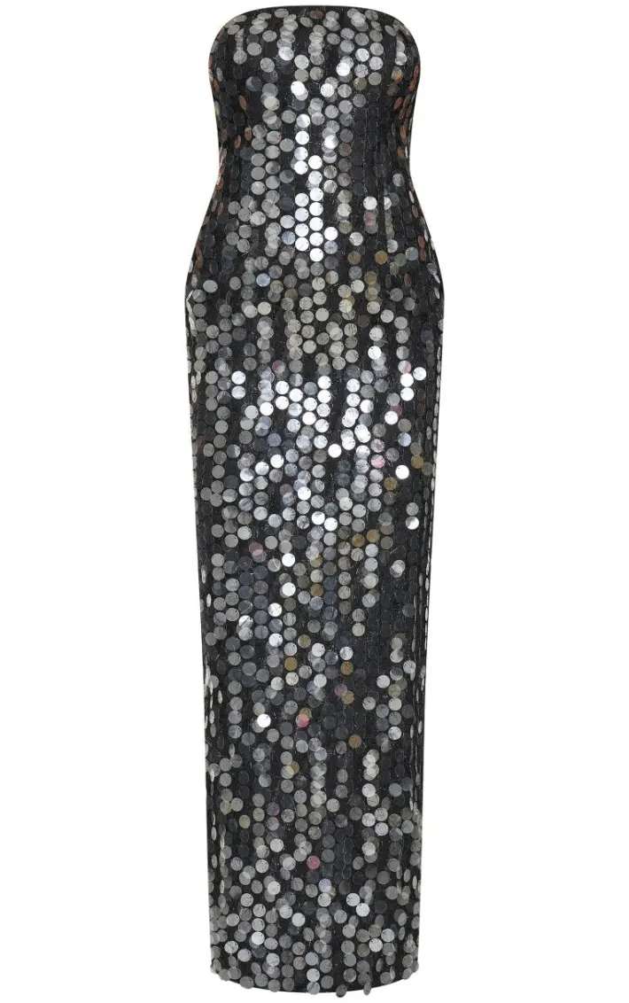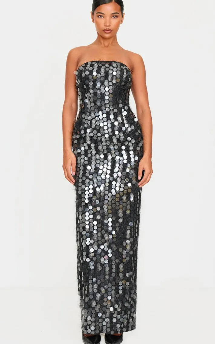 This black textured disk sequin maxi dress has just made styling easy. Brought to you in a chic black shade, with a statement textured disk sequin design and bandeau fit, this dress is sure to give a figure-flattering finish. Pair with simple accessories and black stiletto heels for a finished look we can’t get enough of.