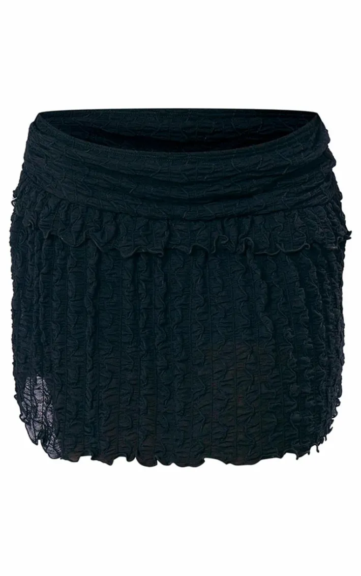 Make this black textured jersey frill hem mini skirt a staple in your weekend wardrobe. Brought to you in a black hue textured jersey material with a frilled hem design and a mini fit, how can you go wrong? Style this mini skirt with a statement top, heels and sunglasses for a look that is guaranteed to make heads turn.